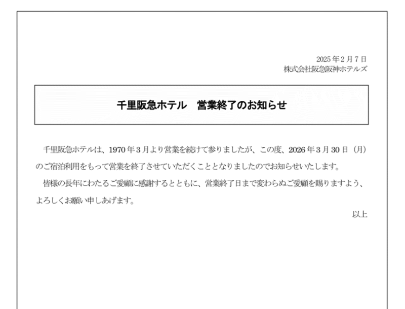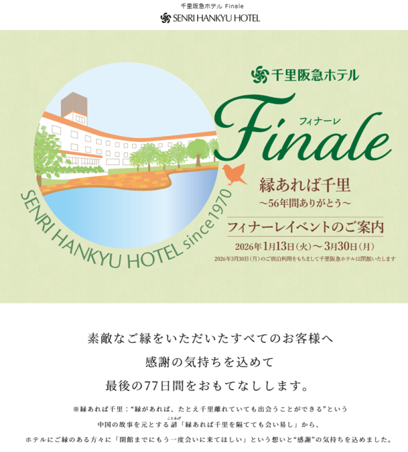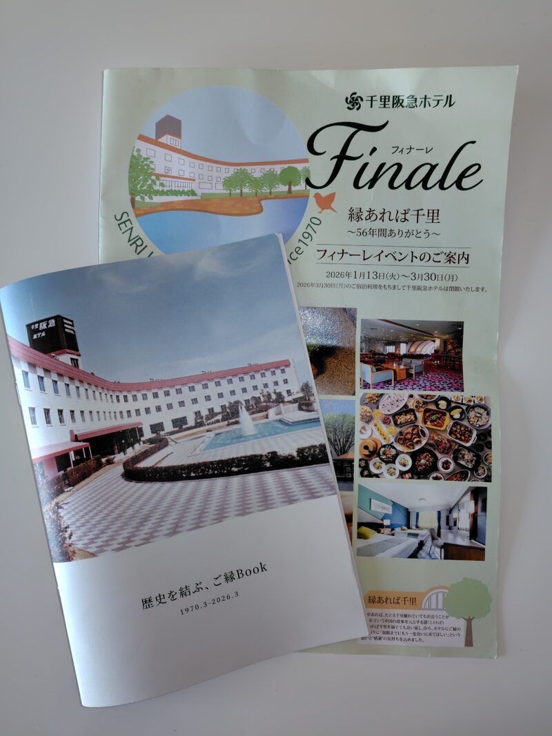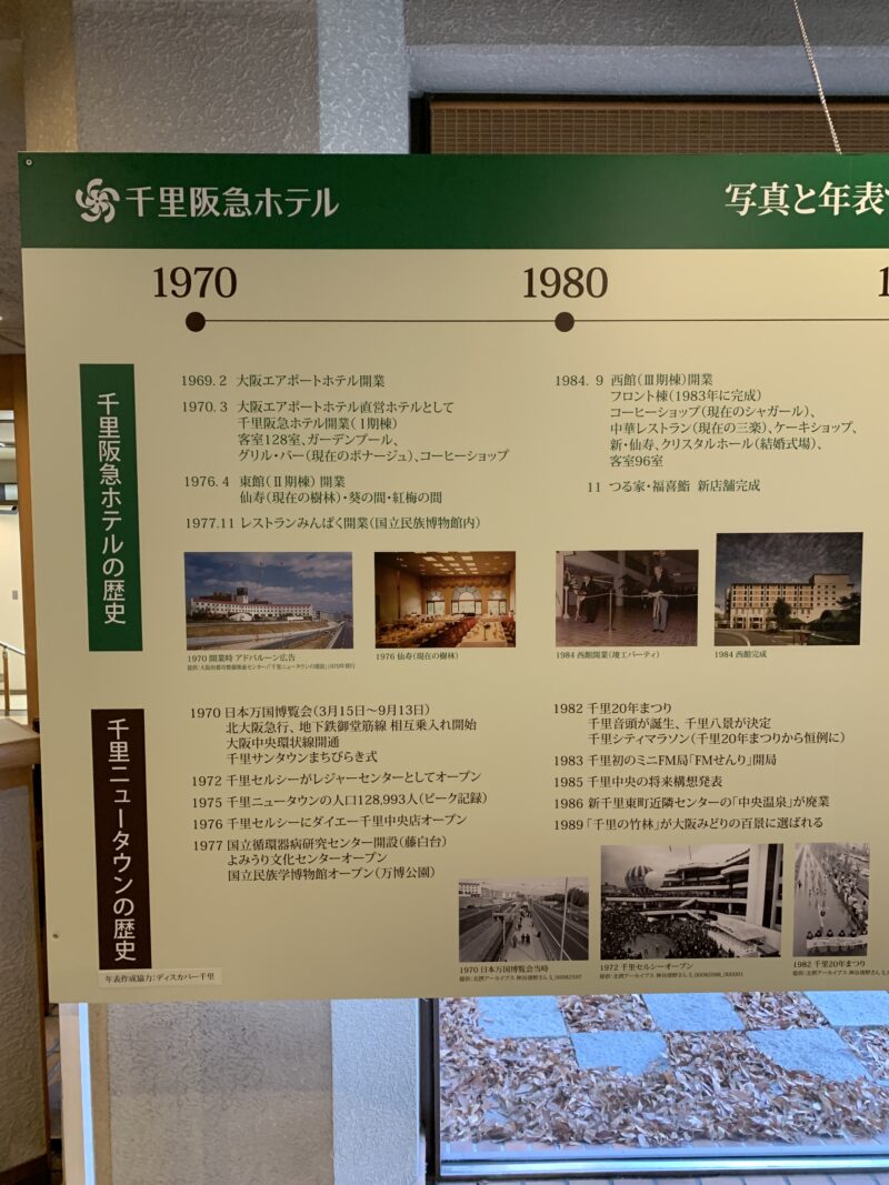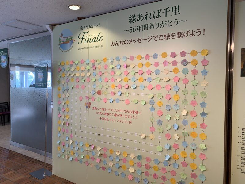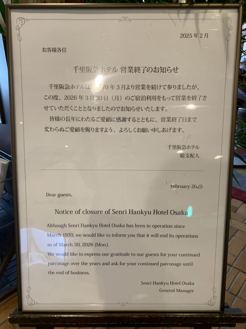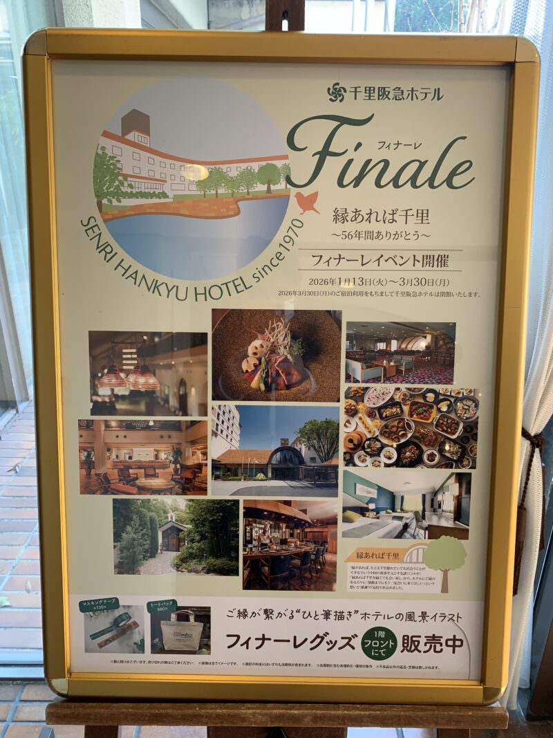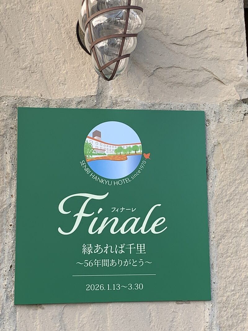 非常に名残惜しいのですが、「千里阪急ホテル」が閉館の運びとなりました。想い返すと、大学の友達のバイト先であったころからのお付き合い。結婚式参列とか、同窓会とか・・・想い出がある方も多いと思います。