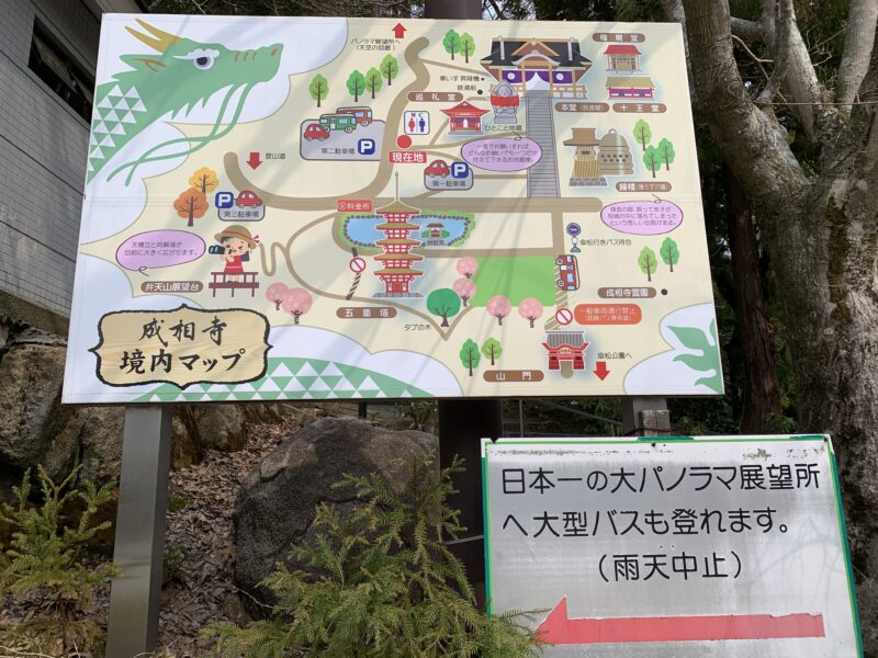 登っていくと、お寺の駐車場に到着しました。入場料500円でさらに登る急坂への道が通行可能となります。まず、成相山パノラマ展望台で天橋立を見てから、成相寺へお参りすることにいたしました。